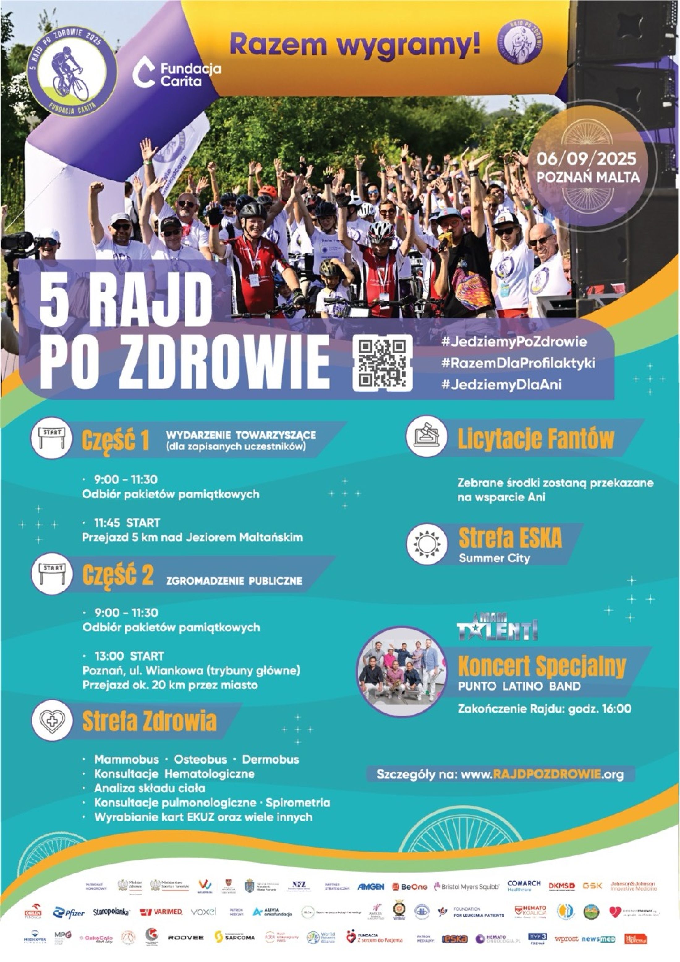 Za nami V Rajd po Zdrowie – wydarzenie, które już po raz piąty połączyło prawie 700 uczestników osób wokół idei zdrowia, profilaktyki i solidarności z pacjentami hematoonkologicznymi. Z całego serca dziękujemy: Ponad 45 Wolontariuszom i ekipie organizacyjnej – za ogrom serca, poświęcony czas i ciężką pracę, dzięki której Rajd mógł odbyć się na tak wysokim poziomie. Serdecznie dziękujemy! Uczestnikom – za Waszą obecność, energię i wspaniałą atmosferę, którą wspólnie stworzyliśmy. Ekipie rowerowej i zabezpieczającej Rajd – za profesjonalizm, opiekę nad trasą i wsparcie uczestników w każdym momencie. Służbom medycznym i ratowniczym – za czuwanie nad bezpieczeństwem i gotowość do działania w każdej chwili. Patronatowi Honorowemu – za objęcie Rajdu swoim autorytetem: Ministerstwo Sportu i Turystyki, Marszałek Województwa Wielkopolskiego Marek Woźniak, Miasto Poznań, Narodowy Fundusz Zdrowia, Ministerstwo Zdrowia, Województwo Wielkopolskie. Partnerom Strategicznym – za kluczowe wsparcie i współtworzenie naszej inicjatywy: Amgen, Bristol Myers Squibb, Comarch Healthcare, Fundacja DKMS, GSK, Johnson & Johnson, Fundacja ORLEN, Pfizer, Staropolanka, Voxel, BeOne, Varimed. Patronom Misyjnym – za wspólną misję i wzmacnianie przekazu o zdrowiu: Alivia, Amicus Fundacja Łuszczycy i ŁZS, Automobilklub Wielkopolski, Stowarzyszenie Kierunek Zdrowie, Fundacja Medicover Polska, Onkocafe, Polskie Towarzystwo Chorób Płuc, ROOVEE, Polskie Towarzystwo Hematologów i Transfuzjologów, Sarcoma, Ruch Onkologiczny PARS, World Patients, All Can – razem na rzecz onkologii i hematologii, Alliance, Fundacja Z sercem do pacjenta, Fundacja Bezpieczeństwo Dla Pacjentów, Foundation for Leukemia Patients, Hematokoalicja, Instytut Praw Pacjenta i Edukacji Zdrowotnej, Klub Turystyki Kolarskiej Kalinka, Myeloma Patients Europe. Patronom Medialnym – za udział w wydarzeniu i promowanie naszej inicjatywy: ESKA Poznań News, hematoonkologia.pl, TVP3 Poznań, Wprost, NewsMed, MedExpress.pl. Ambasadorom Rajdu – za to, że z takim zaangażowaniem promujecie ideę zdrowia i wspieracie nas swoją obecnością: Mariola Bojarska-Ferenc, Adam Wyszyński, Oliwia Mikulska, Wojciech Fibak, Małgorzata Sobańska, Czesław Lang, Hubert Hurkacz. Fotografom, ekipie technicznej i mediom – za uchwycenie pięknych momentów i oprawę, która zostanie z nami na długo: Michał Gmitruk Production. Mieszkańcom Miasta Poznań – za wsparcie, życzliwość i wyrozumiałość. To właśnie wspólna praca i zaangażowanie tylu osób sprawiły, że mogliśmy po raz piąty spotkać się na trasie Rajdu po Zdrowie. Dziękujemy! Kolejność wymienionych osób i instytucji jest przypadkowa – każdy z Was jest dla nas równie ważny.